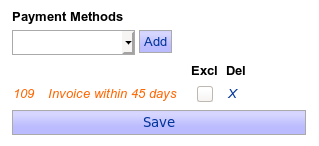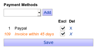 - No payment methods are selected. The customer can pay by all default configured payment methods, except the for selected customers only methods.